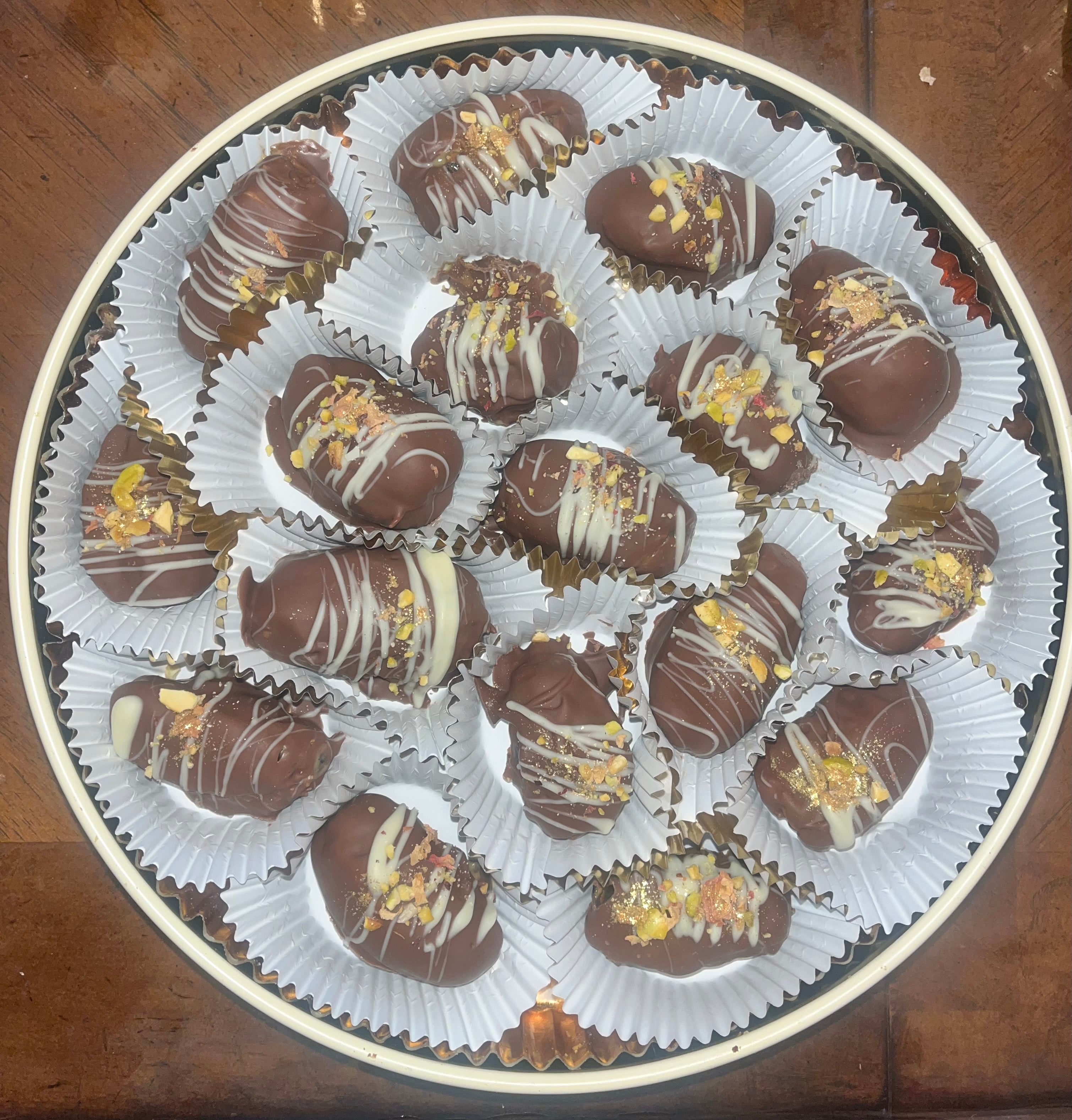 (Chocolate-covered dates filled with pistachio cream)